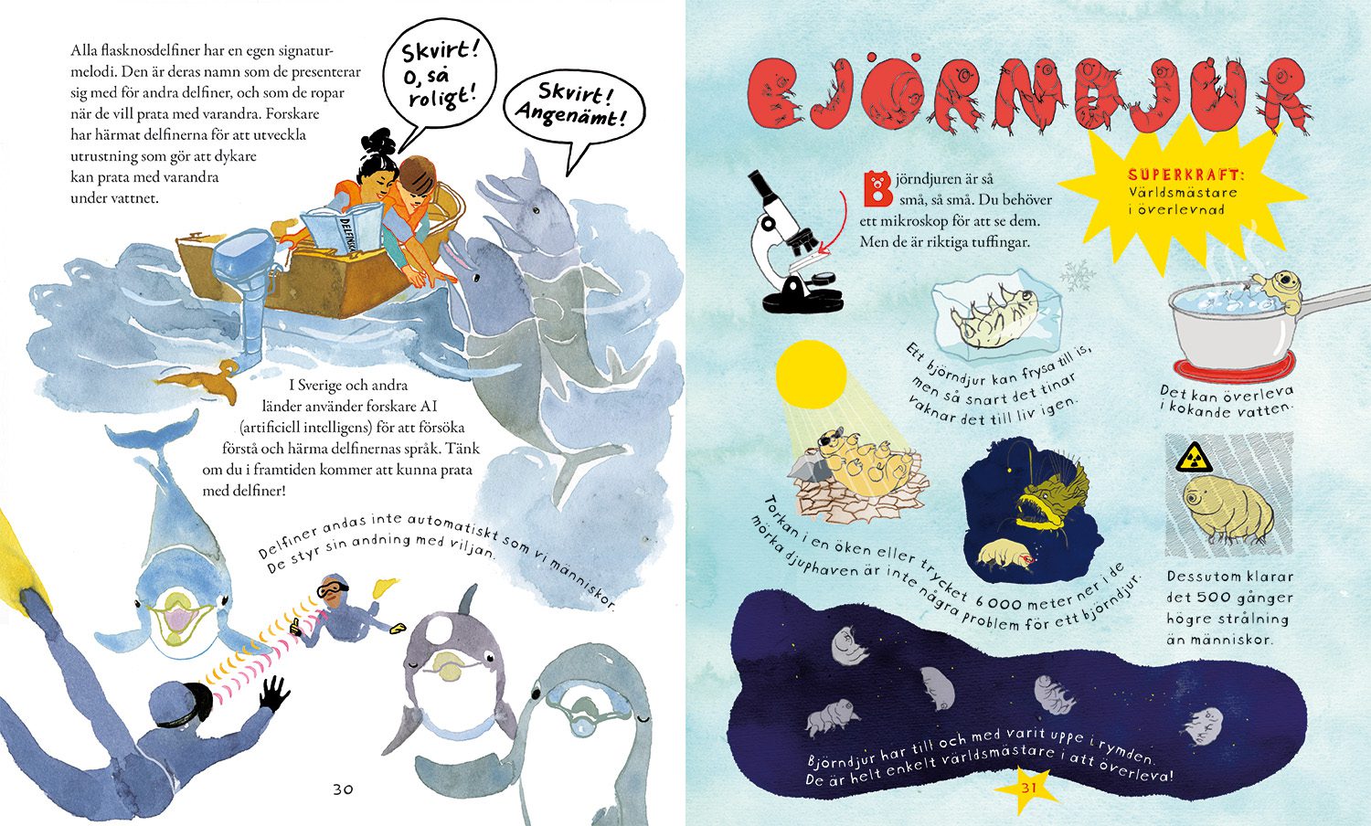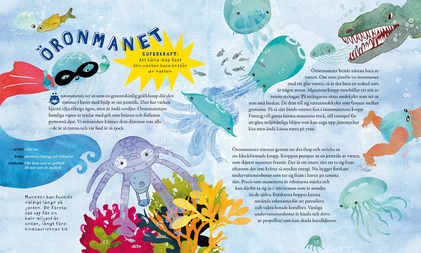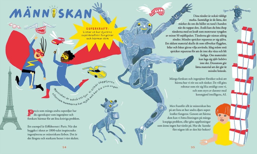 Djur med superkrafter – 18 djur som vi vill härma Författare: Ulla Karlsson Ottosson Illustration och grafisk form: Marie Åhfeldt Rabén & Sjögren