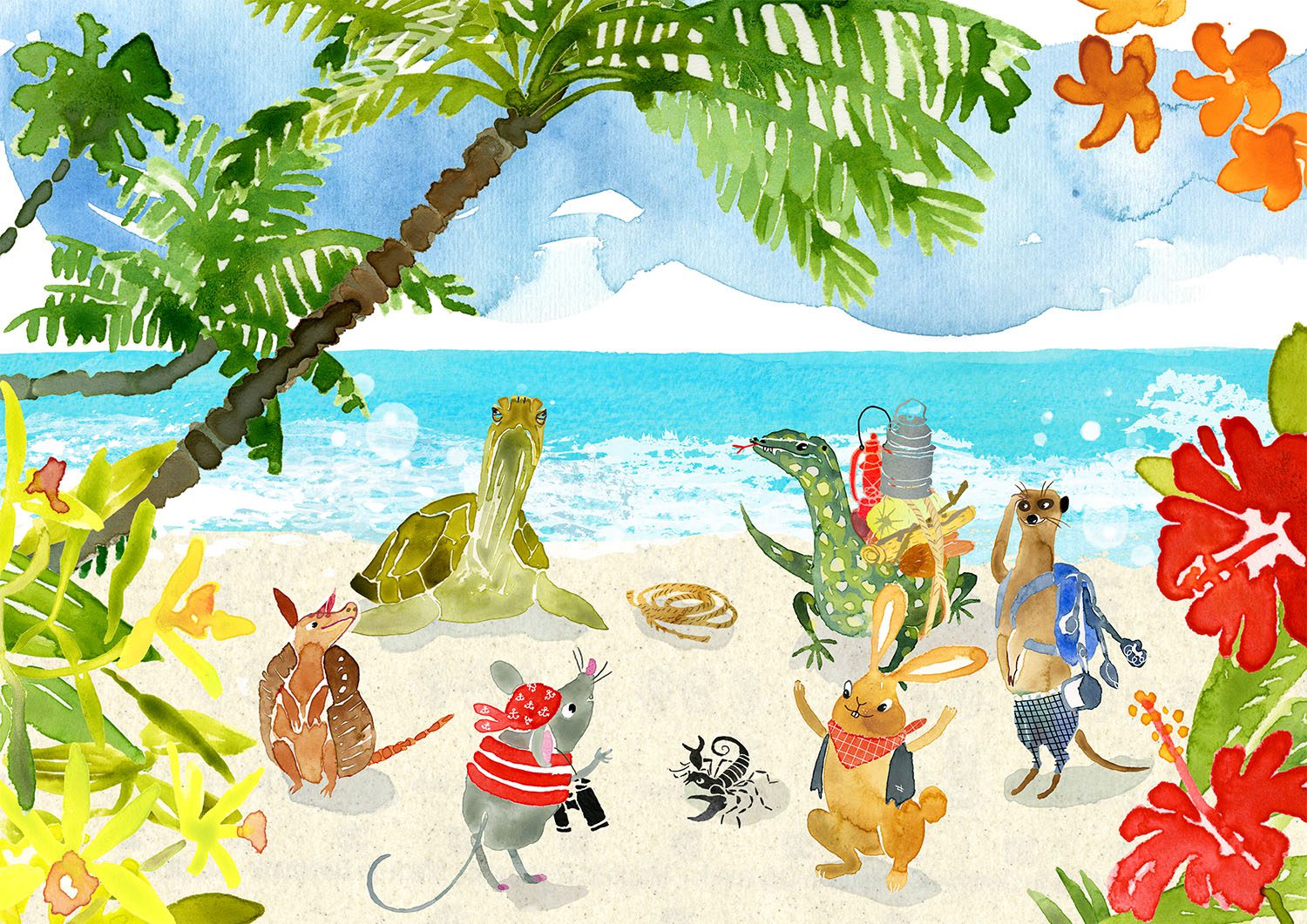 Stranden, uppslag ur Galapagosmusen och KalypsokaninenSköldpaddan, karaktär ur Galapagosmusen och KalypsokaninenUppslag ur Galapagosmusen och KalypsokaninenKaraktärsstudie, Galapagosmusen och KalypsokaninenUppslag ur Galapagosmusen och KalypsokaninenVaranen karaktär ur Galapagosmusen och Kalypsokaninen Draken, karaktär ur Galapagosmusen och KalypsokaninenIllustration ur Galapagosmusen och Kalypsokaninen